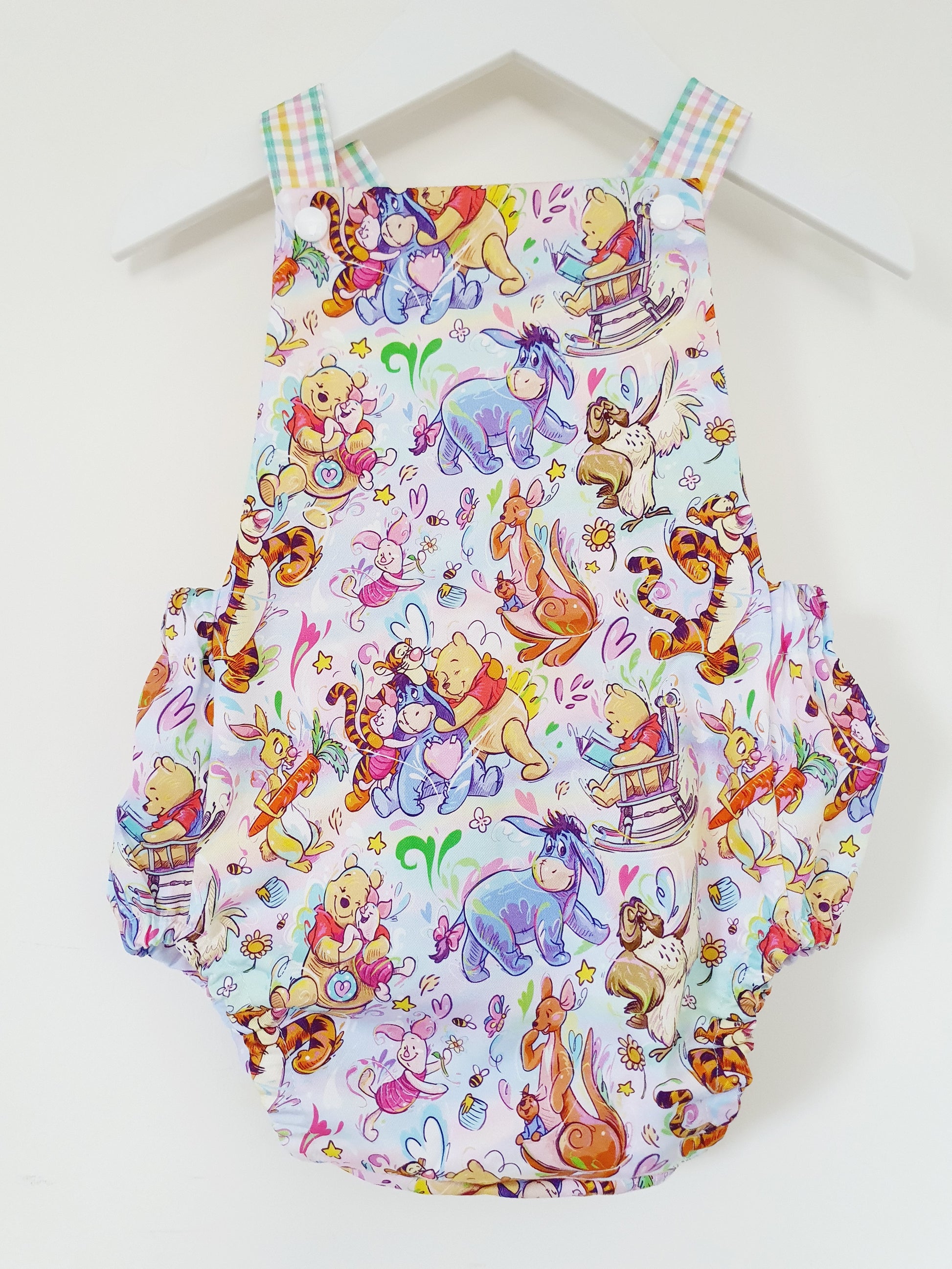 The romper includes crossover back shoulder straps which easily snap on and off front panel of romper.  We have included 2 snap adjustments, at the shortest length it is suited to size 1 baby but we understand some babies are just long....so we have made the straps slightly longer to accommodate this too (when snapped at its longest length).  It is sized 1 (12-18 months) suitable for baby upto 84cm.